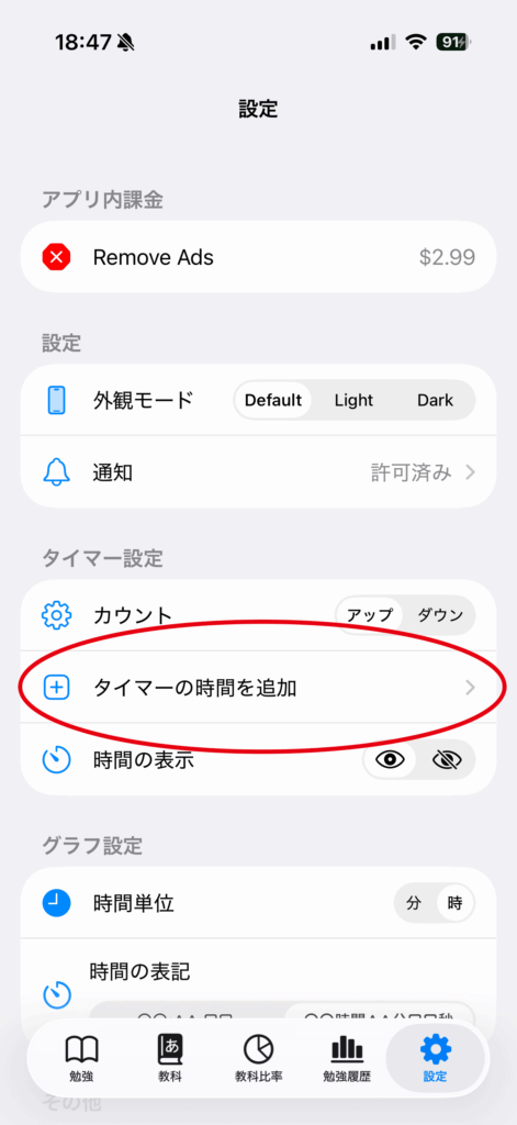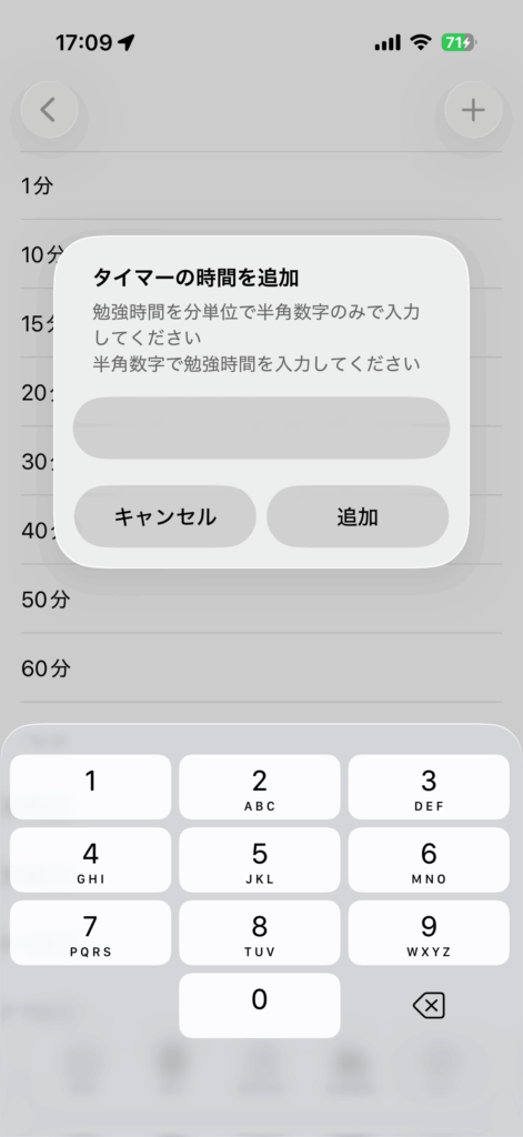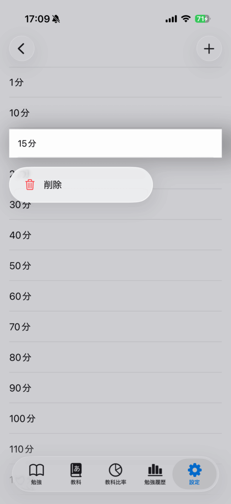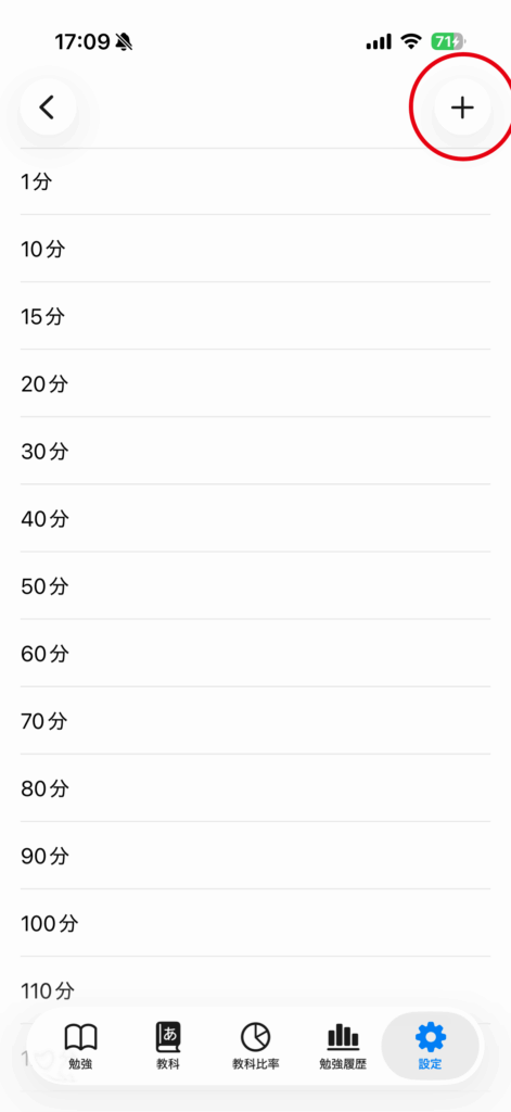 タイマーの時間を追加by studytime2025年7月29日2025年11月22日アプリ内の「設定」を開き「タイマーの時間を追加」を開く右上の「プラス」をタップ好きな時間を入力して、追加をタップ削除追加したタイマーをロングタップすると削除できます。※デフォルトのタイマーは削除できません