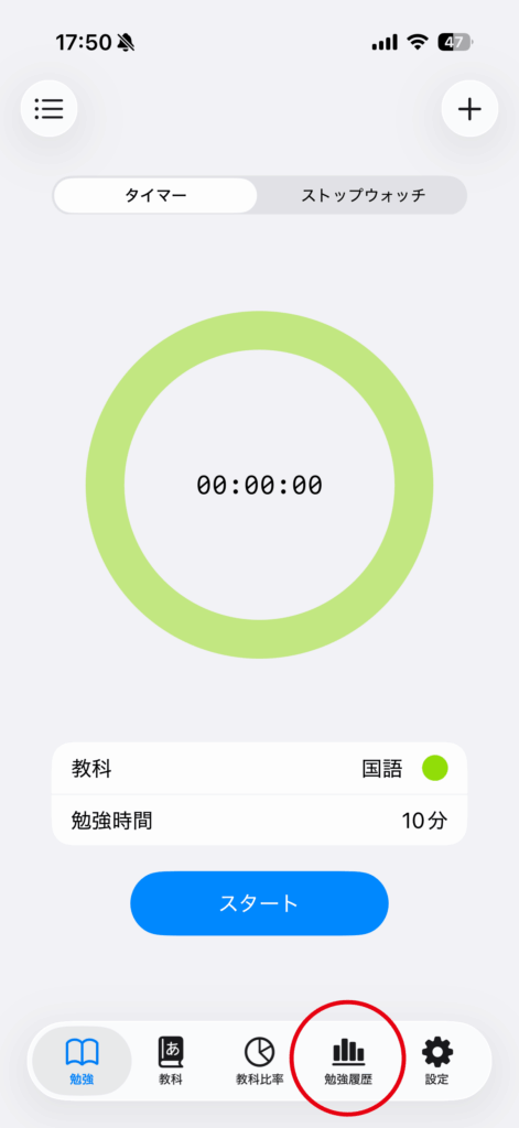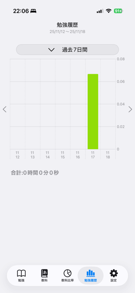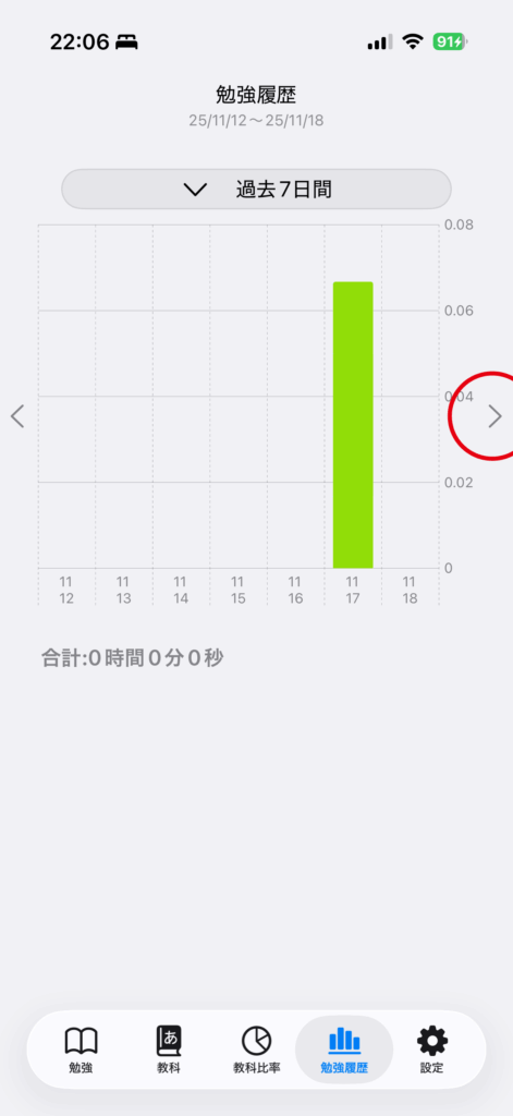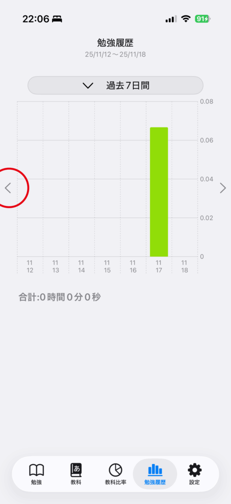 勉強時間を確認by studytime2022年9月16日2025年11月18日「勉強履歴」タブをタップ指定期間内の日別の勉強時間を棒グラフで表示しますどの教科をいつ勉強したのかの確認を行えますグラフ横の「>」をタップすると次の期間を表示しますグラフ横の「<」をタップすると前の期間を表示します