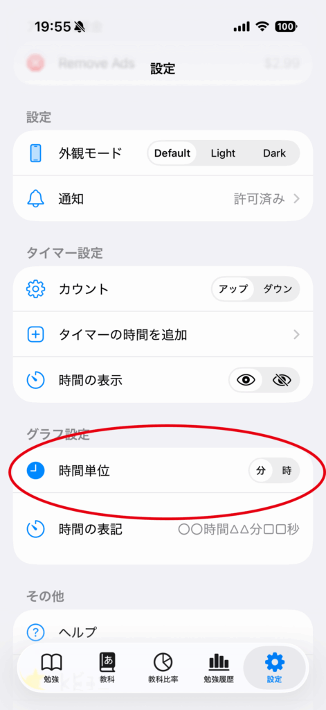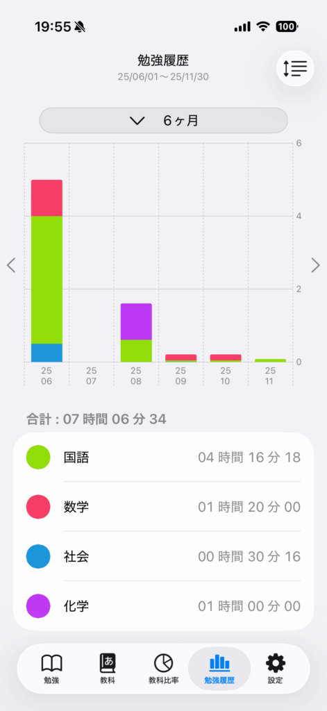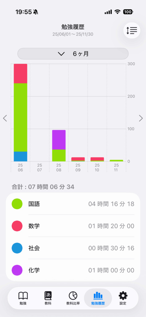 勉強履歴に表示する際に分、時の切り替えが行えます