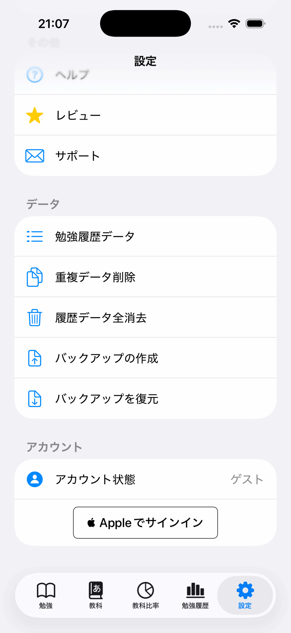 アプリ内の「設定」の下部に「アカウント」の項目内から「Appleでサインイン」をタップしてAppleIDを利用してアカウントを作成できます。