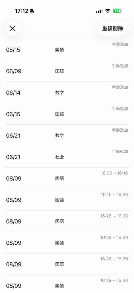 重複データの削除by studytime2025年9月14日2025年11月22日version 4.x.x から version 5.x.xにアップデートした際に一部のユーザーに発生するデータの重複を削除します。通常利用することはありません。重複データがある場合、赤く表示されます。重複データが無い例